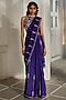 Featuring a purple saree in marina silk base with hand embroidery. It is paired with a chiniya blouse having aari and zardosi embroidery, including a shantoon underskirt. Style it with zircon jewellery, soft curls and embellished heels, perfect for weddings or sangeet ceremony.