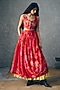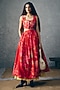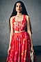 Featuring a red waistcoat in chiniya silk base with print and embroidery. It is paired with a printed skirt. Accentuate it with minimal jewellery and block heels for brunches, garden parties or resort wear.