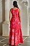 Featuring a red and pink kurta in chiniya base with floral print and sequins embroidery. It is paired with printed palazzo pants. Style it with polki jewellery, soft curls and embellished heels, perfect for daytime weddings or sangeet ceremony.