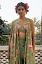 Paulmi & Harsh features a mesmerizing Sage Green Jacket Set that captivates with its elegance. The eye-catching jacket is crafted in organza with hand embroidery. It is paired with a blouse having zardosi detail and georgette palazzo pants. Accessorize it with statement earrings and heels for mehendi ceremonies.