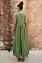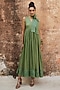 Paulmi & Harsh features a mesmerizing Sage Green Maxi Dress that captivates with its elegance. The eye-catching dress is crafted in silk organza with a v-neckline and gathered detail. It is paired with a scarf. Accessorise the designer dress with statement earrings and heels for an evening or a vacation wear, showcasing style and sophistication.