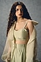 Featuring a sea green jacket in pure organza base with thread embroidery. It is paired with a blouse and pants. Style it with stud earrings, a statement bag, and pump heels for a refined look, perfect for runway appearances, formal meetings, or day events.