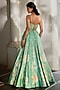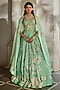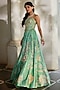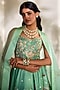 Featuring a tiffany blue lehenga in gokul chiniya and silk base with floral print, aari, zardozi and sequin hand-embroidery. It is paired with a corset blouse having handwork and a pure organza hand embroidered cape. Accentuate it with statement earrings and heels for engagement or sangeet ceremonies.
