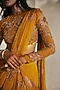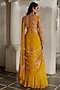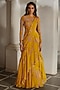 Featuring a yellow saree in chiffon base with floral print and sequins detail. It is paired with a gokul organza blouse having aari, zardosi and mirror hand embroidery. Accentuate it with statement earrings and heels for haldi ceremonies.