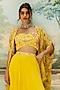 Paulmi & Harsh presents a yellow jacket in georgette base with floral print. It is paired with an embroidered blouse and palazzo pants. Style this set with soft waves and minimal jewellery, perfect for daytime weddings, garden parties, or haldi ceremonies.