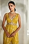 Featuring a yellow jumpsuit in jacquard base with hand embroidery. Style it with polki or zircon jewellery, soft curls and embellished heels, perfect for daytime weddings or haldi ceremony.