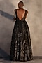 Featuring a carbon black dress in lace base with floating flowers, plunging neck and ruched bodice. Accentuate it with statement earrings and block heels for cocktail parties.