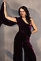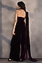 Featuring a wine jumpsuit in velvet base with shoulder drape detail. Accentuate it with statement earrings and block heels for cocktail parties.