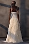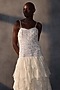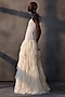 Featuring an ivory layered corset gown in taffeta base with beaded bodice and feather detailing. Accentuate it with statement earrings and block heels for cocktail parties.