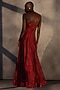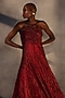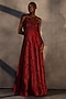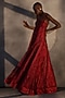 Featuring a ruby red panelled dress in lace base with applique floral, cutwork, sequins and crystal embroidery. Accentuate it with statement earrings and block heels for cocktail parties.