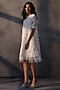 Featuring a white trapeze dress in lace base with crystal and bugle bead embroidery, including crystal banding and a boat neck. Accentuate it with statement earrings and block heels for cocktail parties.