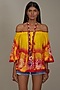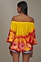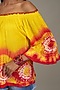 Featuring a yellow and red off-shoulder top in cotton base with bell sleeves and tie-dye detailing. Style it with block heels and statement earrings for a casual yet classy look.