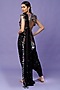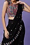 Featuring a black blouse in georgette base with zardosi embroidery. It is paired with matching mukaish silk dhoti pants and an attached drape.
