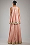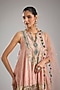 Featuring a blush pink short kurta in silk mul base with resham and pearl embroidery. It is paired with a sharara and a mukaish net dupatta. Accentuate it with statement earrings and heels for a sleek look, perfect for family gatherings, festive occasions or wedding ceremonies.