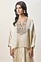 Featuring a champagne top in modal satin base with embroidery. It is paired with a lungi-style skirt having an asymmetrical hem. Accentuate it with jewellery and heels for a festive occasion or wedding ceremony.