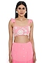 Featuring a coral and pink ombre gathered lehenga in georgette base with embroidery. It is paired with an embroidered crop top and a mukaish net dupatta. Style it with statement earrings and heels for a wedding or engagement ceremony.