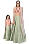 This set features a dusky rose sleeveless blouse in brocade. It comes along with mint lehenga in brocade and dusky rose dupatta in net with crochet lace.