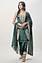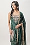 Featuring an emerald green kurta in velvet base with embroidery. It is paired with farshi salwar pants and mukaish silkmul dupatta. Accentuate it with jewellery and heels for a festive occasion or wedding ceremony.