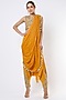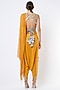 Featuring a german mustard blouse in crepe base with back tie-up and zardosi embroidery. It is paired with matching low drop crotch pants and an attached tasseled mukaish georgette drape. Perfect wear for festive occasions or wedding ceremonies.