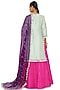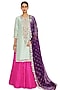 Featuring a hot pink lehenga in dupion silk base. It is paired with a powder blue kurta and a purple mukaish organza dupatta. Accentuate it with kundan polki jewellery and heels for a wedding or sangeet ceremony.