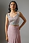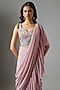 Featuring a lilac draped frilled saree in mukaish georgette base. It is paired with a georgette blouse having resham and velvet embroidery. Style it with strappy heels and bold earrings for a polished look. Perfect for cocktail nights, receptions, sangeet functions, and glamorous festive events.