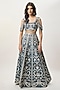 Featuring a navy blue quilted choli in velvet base with floral motifs embroidery. It is paired with an embroidered lehenga and attached bajuband sleeves. Accentuate it with jewellery and heels for a festive occasion or wedding ceremony.