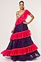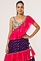 Featuring a purple lehenga in mukaish georgette base. It is paired with a matching georgette embroidered choli and attached hot pink soft net frills.