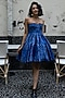 Featuring an electric blue mini tube dress in thick satin base with print.