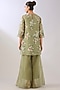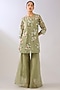 Featuring a jade green top in silk organza base with thread embroidery. It is paired with a slip. Accentuate it with pants, stud earrings, mules and a clutch for festive occasion, pooja or cultural celebrations.