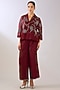Featuring ruby red flared pants in silk organza base with beads embroidery at the bottom. Accentuate it with a top, stud earrings, mules and a clutch for festive occasion, pooja or cultural celebrations.