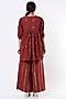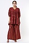 Featuring a blood red top in cotton base with woven gold butti. It is paired with matching palazzo pants.