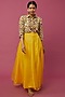 Featuring a multi-colored shirt in soft cotton base with thread embroidery. It is paired with a contrasting yellow organza skirt.