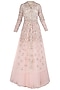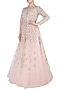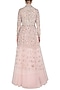 Featuring a baby pink lehenga in net base. It is paired with an ice blue french knot hand embroidered jacket in raw silk base.