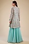 Featuring an aqua blue high-low peplum kurta in chanderi and organza base with hand and machine embroidery. It is paired with pants. Accentuate it with statement earrings and block heels for festive ceremonies.