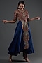 Featuring a blue asymmetrical kalidar kurta in chanderi base. It is paired with matching printed pants.