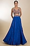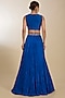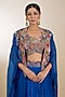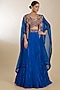 Featuring a blue cape in chanderi and organza base with velvet patchwork embroidery. It is paired with a blouse and a skirt. Accentuate it with statement silver earrings and embroidered heels for a stylish ensemble, ideal for sangeet nights or festive soirees.