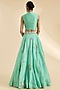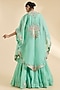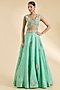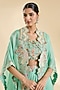 Featuring a cyan blue cape in organza, chanderi and brocade base with hand and machine embroidery. It is paired with a blouse and a skirt. Accentuate it with minimal jewellery and heels for a festive look or sangeet ceremony.