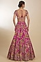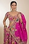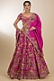 Featuring a fuchsia lehenga in raw silk base with velvet patchwork. It is paired with a blouse and a dupatta. Accentuate it with a regal polki choker set and embellished juttis for an effortlessly ethereal bridal look.