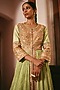 Featuring a green asymmetric kalidar kurta in crushed base with embroidery. It is paired with chanderi printed pants. Accentuate with dangler earrings and heels for festive occasions.