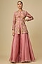 Featuring a lilac peplum in organza base with patchwork embroidery. It is paired with sharara pants. Accentuate it with kundan jhumkas and embroidered juttis for a stylish ensemble, for festive functions or any pre-wedding celebrations.