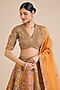 Featuring a multi-colored lehenga in chanderi brocade base. It is paired with a blouse and an organza dupatta. Accentuate the designer lehenga with swarovski jewellery, embellished heels and a clutch for a regal look, Perfect wear for your sangeet or wedding ceremony.