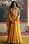 Featuring a mustard kalidar anarkali in chanderi, brocade and organza base with patchwork. It is paired with a dupatta. Accentuate it with statement earrings and heels for a festive look, wedding or engagement ceremony.