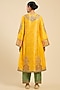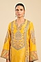 Featuring a mustard long phiran kurta in chanderi, chanderi brocade and organza base. It is paired with pants and an ombre dupatta. Accentuate it with chandbali earrings and block heels for a stylish ensemble, perfect for festive occasions, pooja or haldi ceremonies.