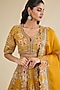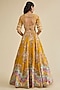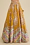 Featuring a mustard kalidar lehenga in organza and chanderi base with brocade patchwork. It is paired with a blouse and a dupatta. Accentuate it with statement jewellery and heels, perfect for haldi ceremonies, daytime weddings or festive gatherings.