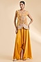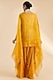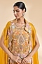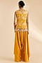 Featuring a mustard cape in organza, satin, chanderi and brocade base with patchwork. It is paired with a short jacket and dhoti pants. Accentuate it with minimal jewellery and heels for a festive look.