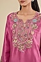 Featuring an old rose kurta in dupion silk and satin base with hand and machine embroidery. It is paired with a high-low dhoti. Accentuate it with pearl studs and embroidered juttis, perfect for festive gatherings, family functions or pre-wedding events.