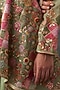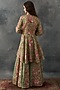 Featuring an olive peplum in organza base with velvet patch work. It is paired with embroidered sharara pants. Style with polki earrings and heels for festive celebrations or mehendi ceremony.
