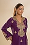 Featuring a purple knee-length kurta in dupion silk and chanderi base with embroidery. It is paired with pants. Accentuate it with kundan jewellery and wedges for a festive look or a wedding ceremony.