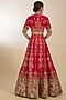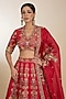 Featuring a red lehenga in raw silk base with velvet patchwork and boota embroidery. It is paired with a blouse and an organza dupatta. Accentuate it with a regal polki choker set and embellished juttis for an effortlessly ethereal bridal look.