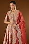 Featuring a red lehenga shimmer brocade base with hand and machine embroidery. It is paired with a blouse and an organza dupatta. Accentuate the designer lehenga with statement jewellery and heels for a wedding, engagement or sangeet ceremony.